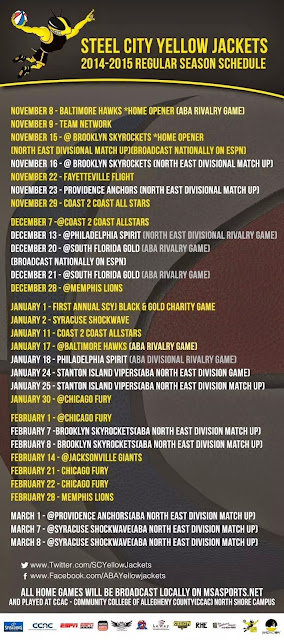412 Stand Up and support your Steel City Yellow Jackets ABA Basketball Team. It is their Inaugural season the of the Legendary American Basketball Association returns to Pittsburgh. They are providing a tremendous opportunity for players to continue their Hoop Dreams by staying competitive and relevant in the rigorous quest for basketball success. Hometown hip hop artists are getting their chance to add to the entertainment landscape by providing halftime entertainment thanks to the direction of Tjuan Benefactor's efforts to merge the two. Catch local heavyweights ,Yung Bru and Grimey Click's own Ruger Rome on Saturday November 8th at the Allegheny Campus Community College Of Allegheny County. For more information on the Steel City Yellow Jackets, check out their article on "This Is 50" here: http://www.thisis50.com/m/blogpost?id=784568%3ABlogPost%3A32702703 or their their article on Pittsburgh Sporting News here: http://www.pittsburghsportingnews.com/steel-city-yellow-jackets-ready-for-inaugural-season-in-the-aba/